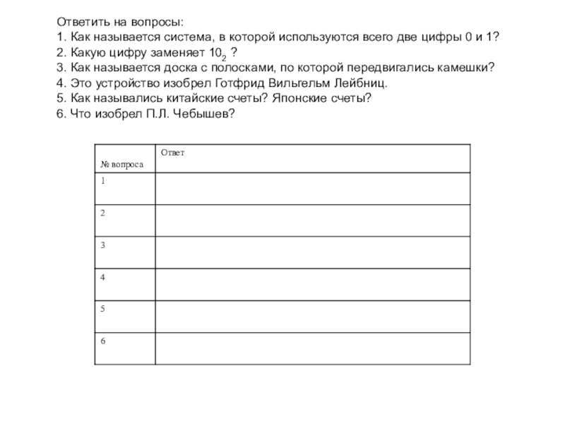 Ответить на вопросы:1. Как называется система, в которой используются всего две цифры 0 и 1?2. Какую цифру