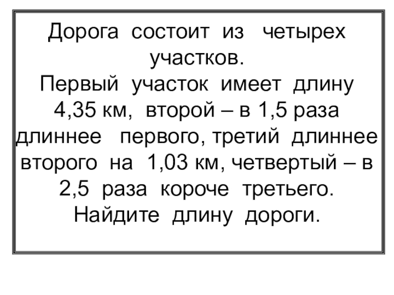 Дорога состоит из  четырех участков.Первый участок имеет длину 4,35 км, второй – в 1,5 раза длиннее