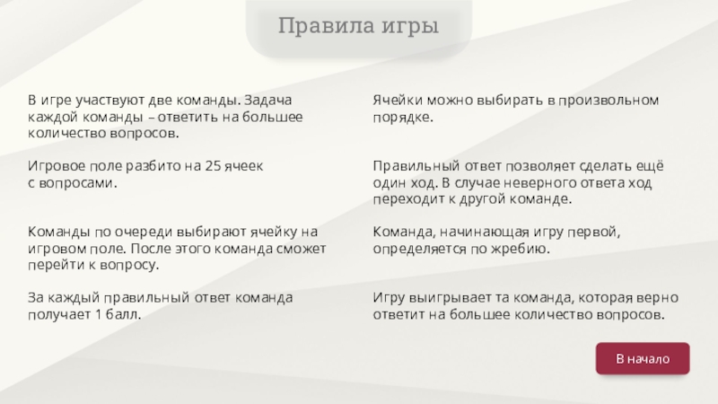 Игру выигрывает та команда, которая верно ответит на большее количество вопросов.