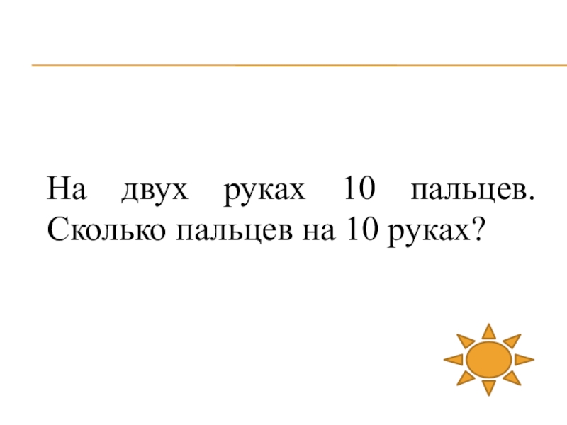 Слайд 30На двух руках 10 пальцев. Сколько пальцев на 10 руках?