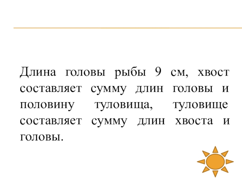 Слайд 41Длина головы рыбы 9 см, хвост составляет сумму длин головы и