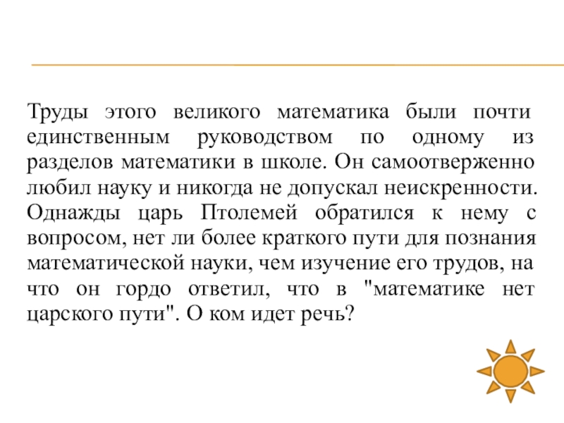 разделов математики в школе. Он самоотверженно любил науку и никогда не допускал неискренности. Однажды царь Птолемей обратился к нему с вопросом, нет ли более краткого пути для познания математической науки, чем изучение его трудов, на что он гордо ответил, что в "математике нет царского пути". О ком идет речь?