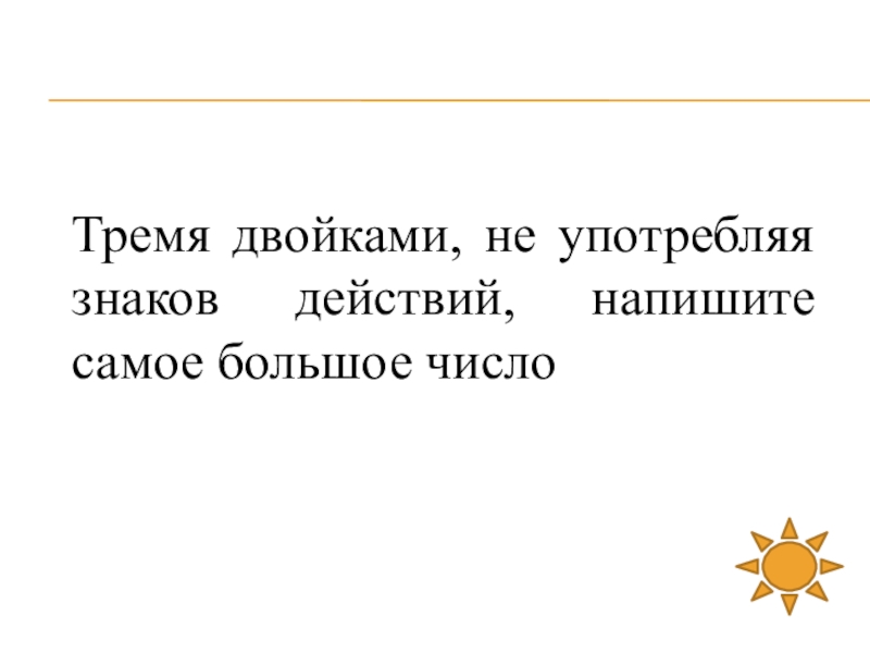 Слайд 19Тремя двойками, не употребляя знаков действий, напишите самое большое число