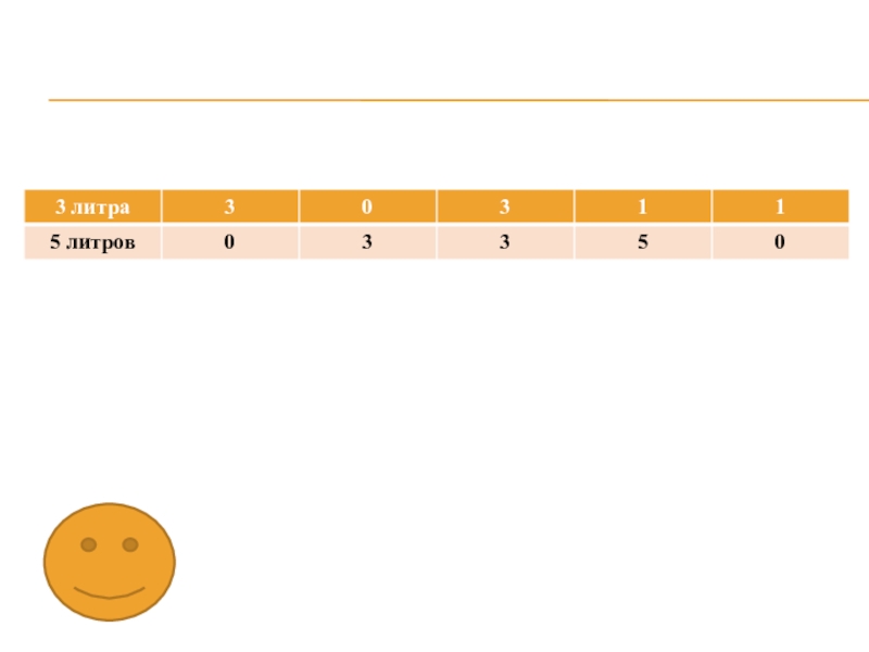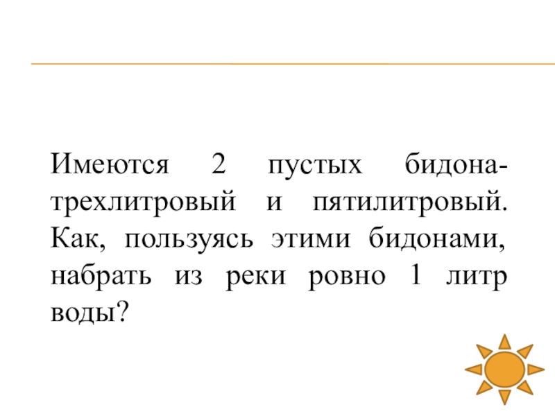 Слайд 36Имеются 2 пустых бидона-трехлитровый и пятилитровый. Как, пользуясь этими бидонами, набрать