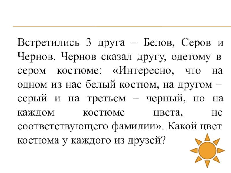 Слайд 38Встретились 3 друга – Белов, Серов и Чернов. Чернов сказал другу,