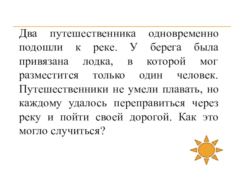 Слайд 13Два путешественника одновременно подошли к реке. У берега была привязана лодка,