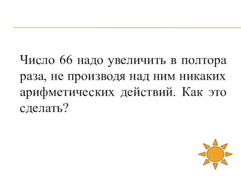 Слайд 49Число 66 надо увеличить в полтора раза, не производя над ним