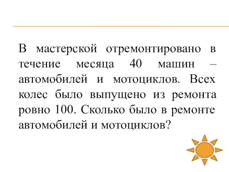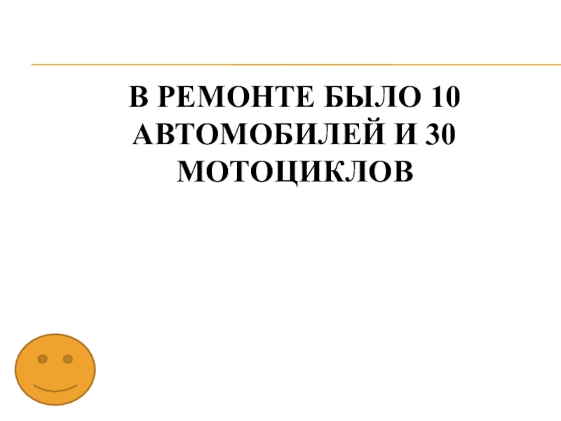 Слайд 52В ремонте было 10 автомобилей и 30 мотоциклов
