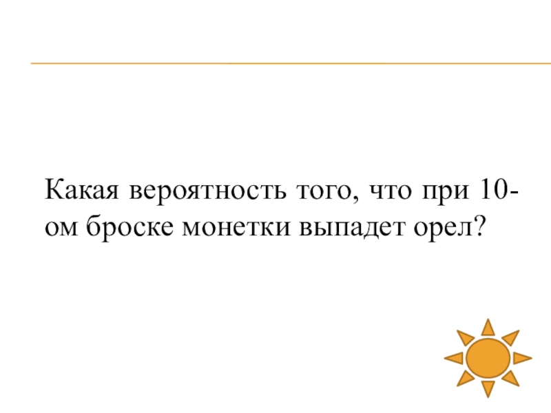 Слайд 43Какая вероятность того, что при 10-ом броске монетки выпадет орел?