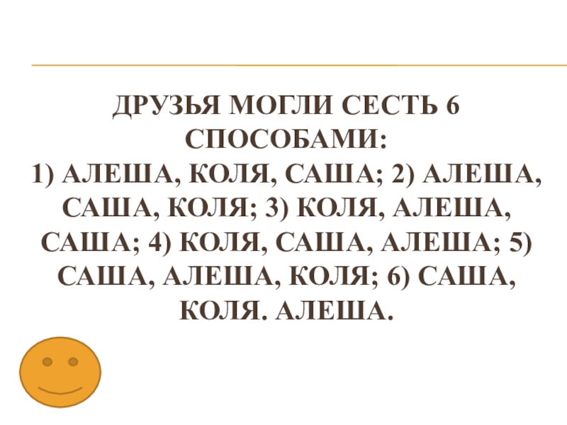 Слайд 48Друзья могли сесть 6 способами: