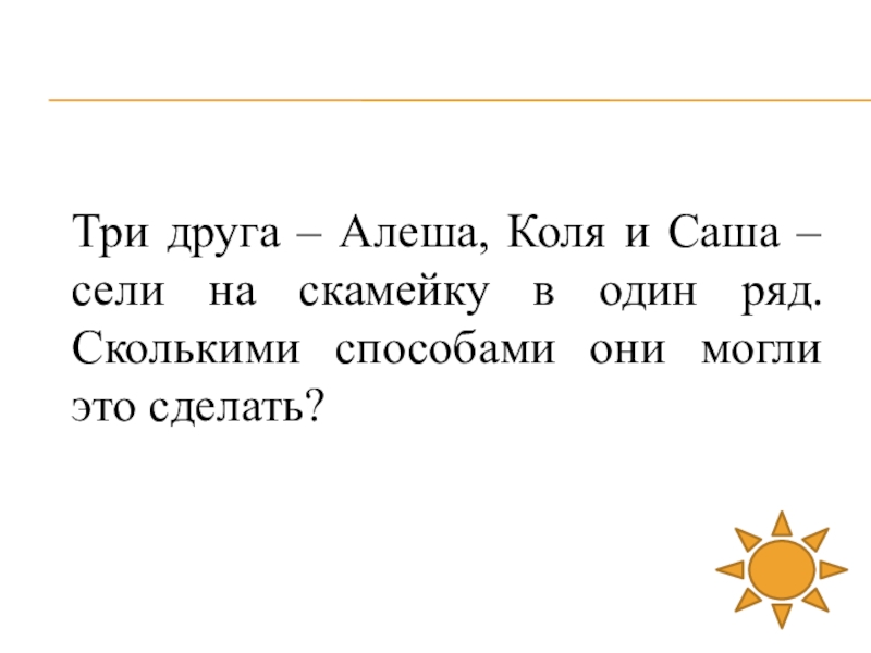 Слайд 47Три друга – Алеша, Коля и Саша – сели на скамейку
