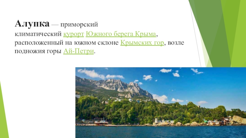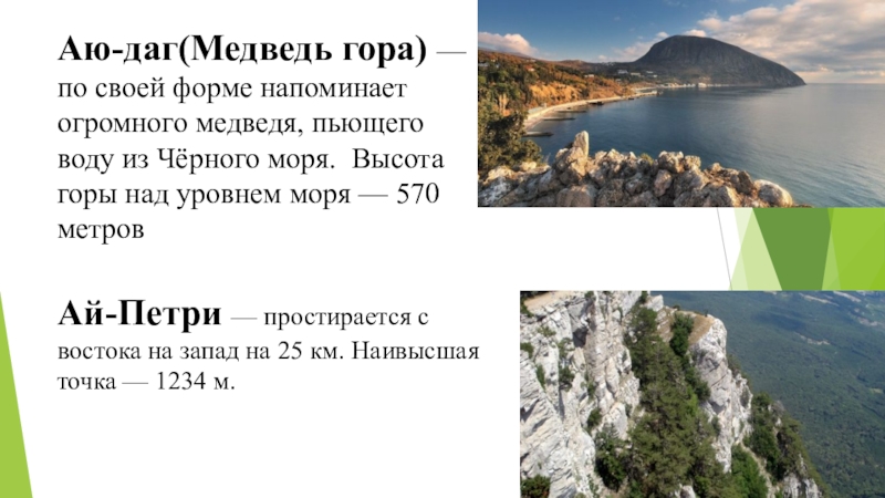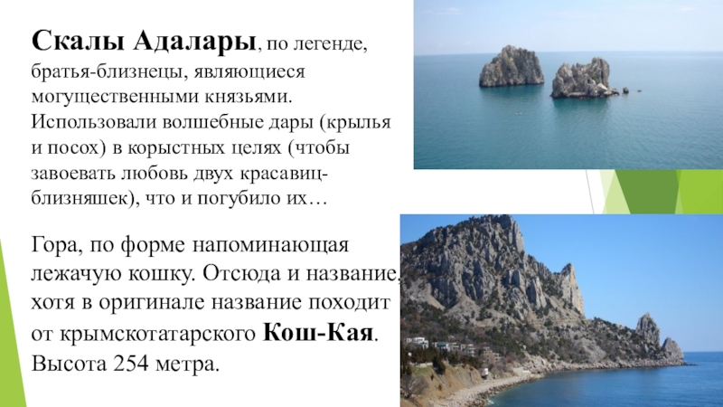 Гора, по форме напоминающая лежачую кошку. Отсюда и название, хотя в оригинале название походит от крымскотатарского Кош-Кая. Высота 254 метра.