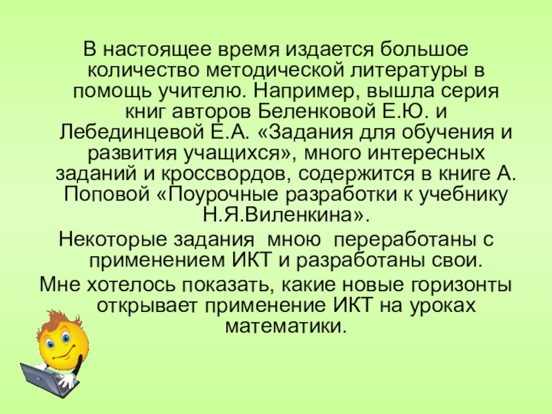 помощь учителю. Например, вышла серия книг авторов Беленковой Е.Ю. и Лебединцевой Е.А. «Задания для обучения и развития учащихся», много интересных заданий и кроссвордов, содержится в книге А.Поповой «Поурочные разработки к учебнику Н.Я.Виленкина».
