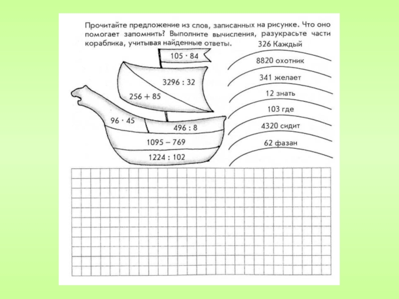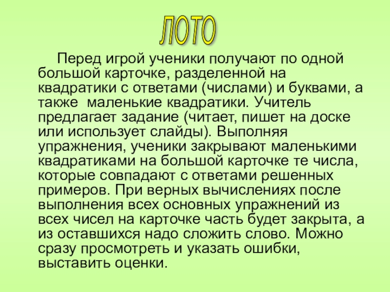 одной большой карточке, разделенной на квадратики с ответами (числами) и буквами, а также маленькие квадратики. Учитель предлагает задание (читает, пишет на доске или использует слайды). Выполняя упражнения, ученики закрывают маленькими квадратиками на большой карточке те числа, которые совпадают с ответами решенных примеров. При верных вычислениях после выполнения всех основных упражнений из всех чисел на карточке часть будет закрыта, а из оставшихся надо сложить слово. Можно сразу просмотреть и указать ошибки, выставить оценки.
