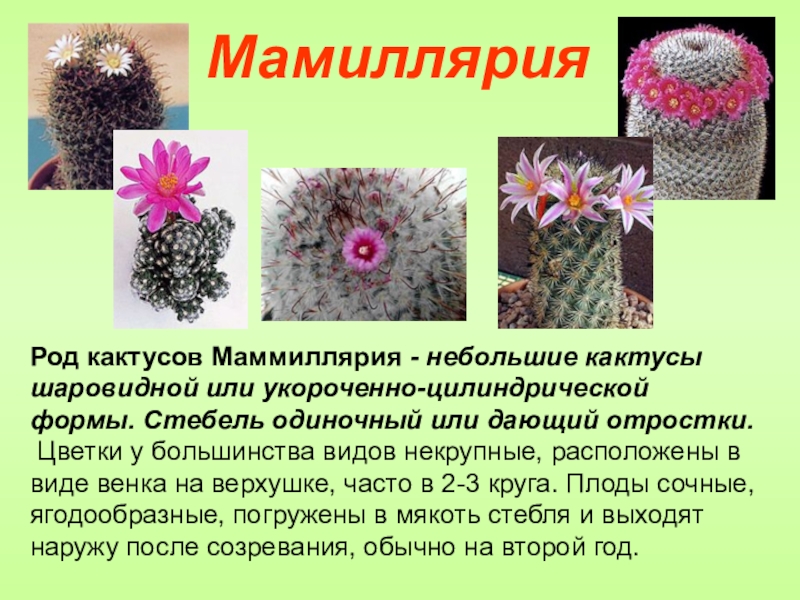 Род кактусов Маммиллярия - небольшие кактусы шаровидной или укороченно-цилиндрической формы. Стебель