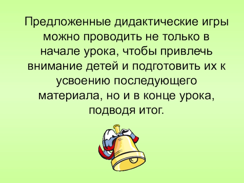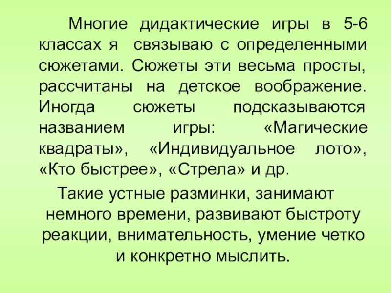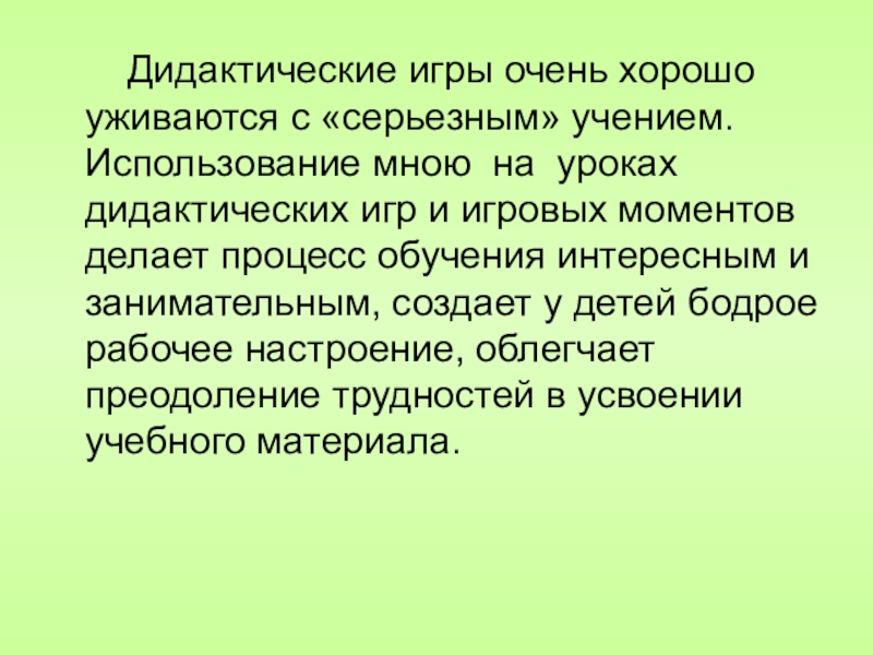 учением. Использование мною на уроках дидактических игр и игровых моментов делает процесс обучения интересным и занимательным, создает у детей бодрое рабочее настроение, облегчает преодоление трудностей в усвоении учебного материала.