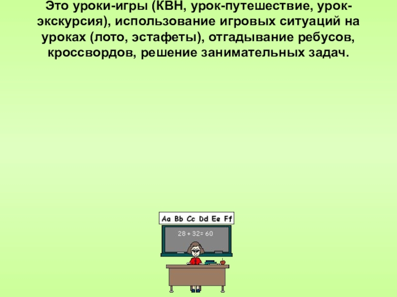 Это уроки-игры (КВН, урок-путешествие, урок-экскурсия), использование игровых ситуаций на уроках (лото, эстафеты), отгадывание ребусов, кроссвордов, решение занимательных задач.