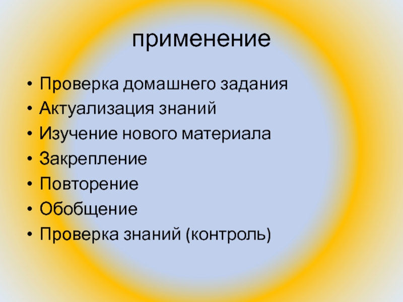 применениеПроверка домашнего заданияАктуализация знанийИзучение нового материалаЗакреплениеПовторениеОбобщениеПроверка знаний (контроль)