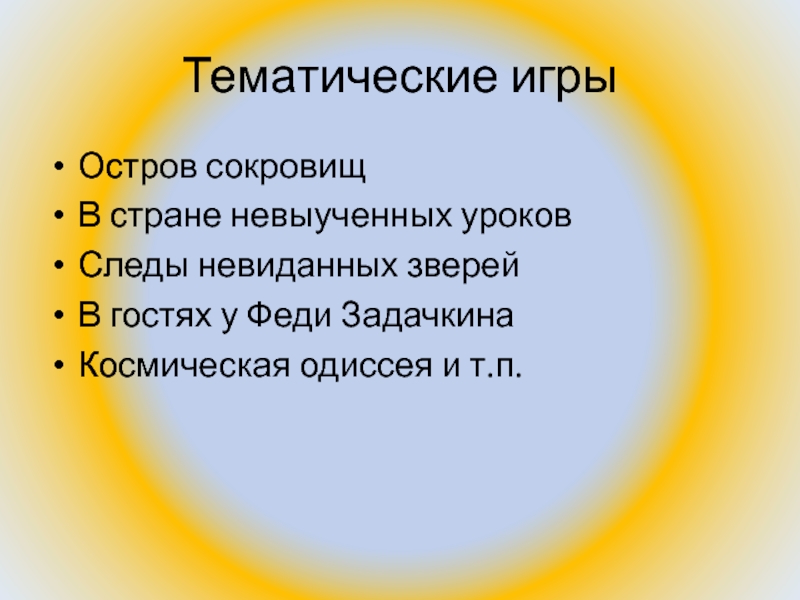 Тематические игрыОстров сокровищВ стране невыученных уроковСледы невиданных зверейВ гостях у Феди ЗадачкинаКосмическая одиссея и т.п.