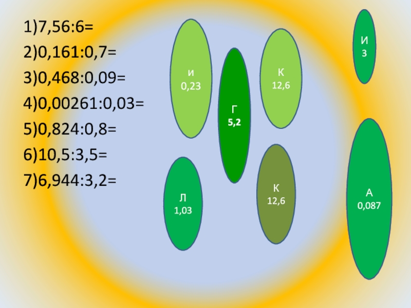 1)7,56:6=2)0,161:0,7=3)0,468:0,09=4)0,00261:0,03=5)0,824:0,8=6)10,5:3,5=7)6,944:3,2=и0,23Г5,2К12,6Л1,03К12,6А0,087И3