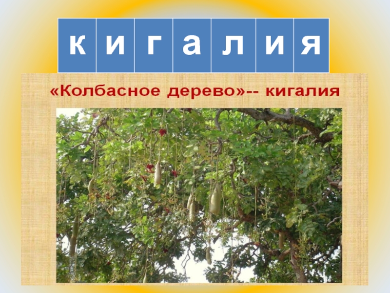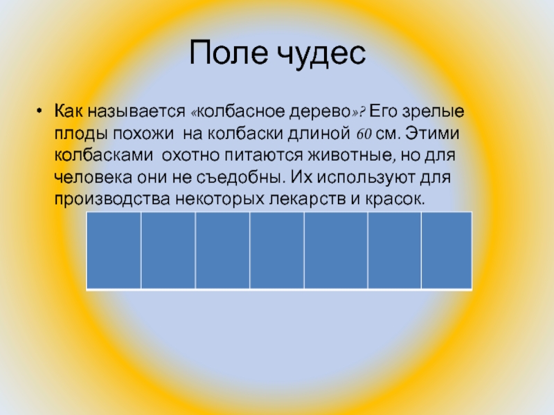 Поле чудесКак называется «колбасное дерево»? Его зрелые плоды похожи на колбаски длиной 60 см. Этими колбасками охотно