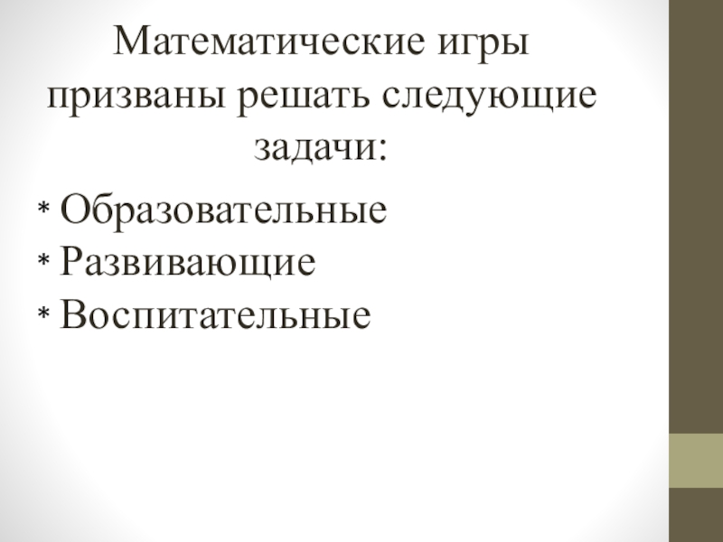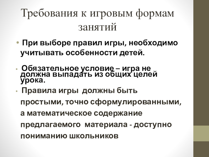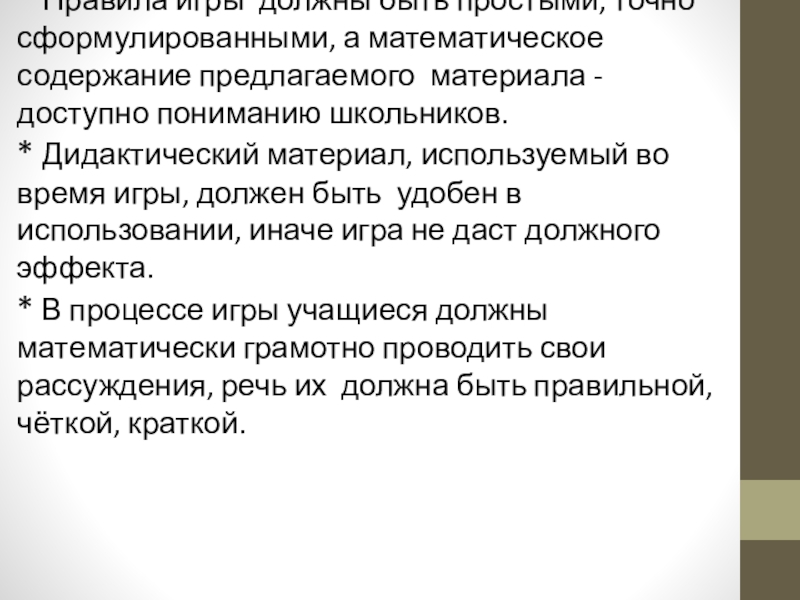Слайд 8* Правила игры должны быть простыми, точно сформулированными, а математическое содержание