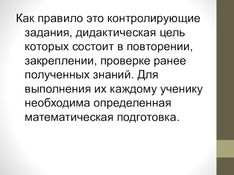 Слайд 13Как правило это контролирующие задания, дидактическая цель которых состоит в повторении,