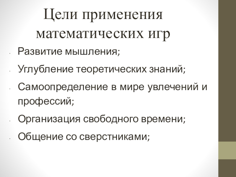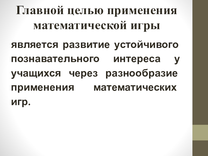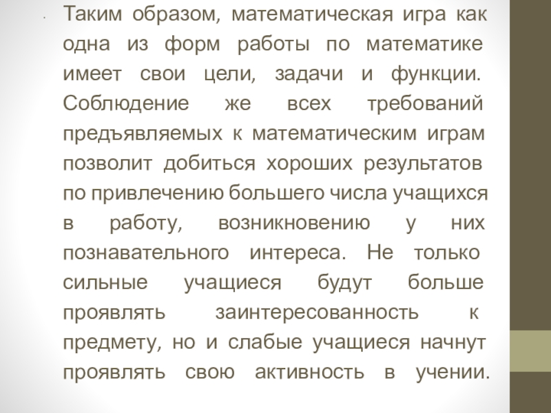 имеет свои цели, задачи и функции. Соблюдение же всех требований предъявляемых к математическим играм позволит добиться хороших результатов по привлечению большего числа учащихся в работу, возникновению у них познавательного интереса. Не только сильные учащиеся будут больше проявлять заинтересованность к предмету, но и слабые учащиеся начнут проявлять свою активность в учении.