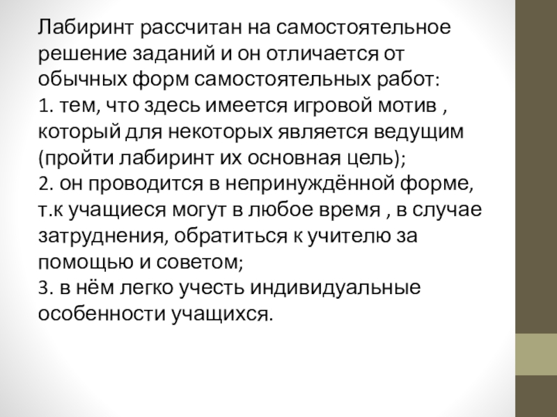 Слайд 19Лабиринт рассчитан на самостоятельное решение заданий и он отличается от обычных