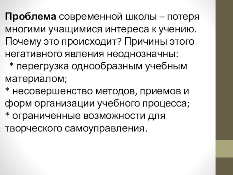 Слайд 2Проблема современной школы – потеря многими учащимися интереса к учению. Почему это