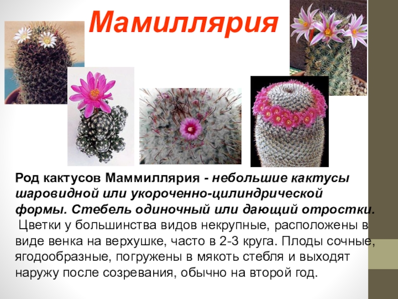 Род кактусов Маммиллярия - небольшие кактусы шаровидной или укороченно-цилиндрической формы. Стебель