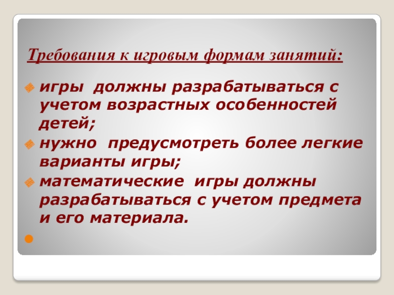 Требования к игровым формам занятий:игры должны разрабатываться с учетом возрастных особенностей детей;нужно предусмотреть более легкие варианты игры;математические