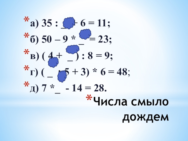 Числа смыло дождема) 35 : _ + 6 = 11;б) 50 – 9 * _ = 23;в)