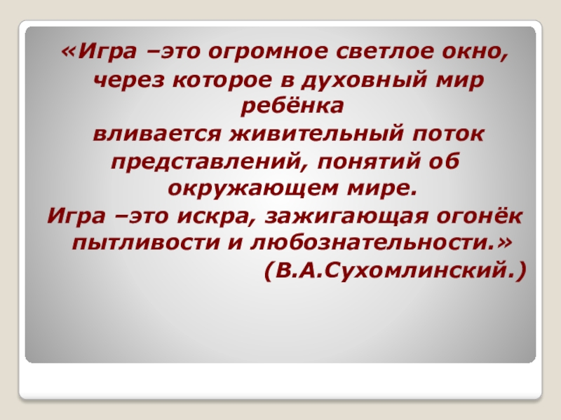 «Игра –это огромное светлое окно, через которое в духовный мир ребёнка вливается живительный потокпредставлений, понятий об окружающем мире. Игра –это искра, зажигающая огонёк пытливости и любознательности.»(В.А.Сухомлинский.)