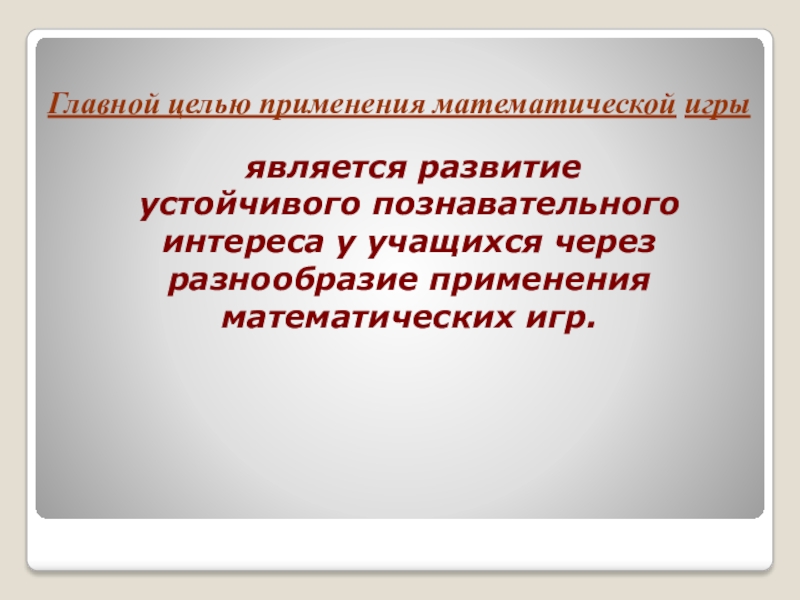 Главной целью применения математической игры  является развитие устойчивого познавательного интереса у учащихся через разнообразие применения математических