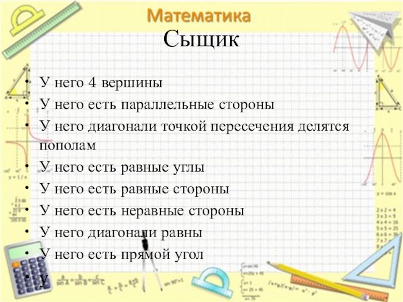 СыщикУ него 4 вершиныУ него есть параллельные стороныУ него диагонали точкой пересечения делятся пополамУ него есть равные