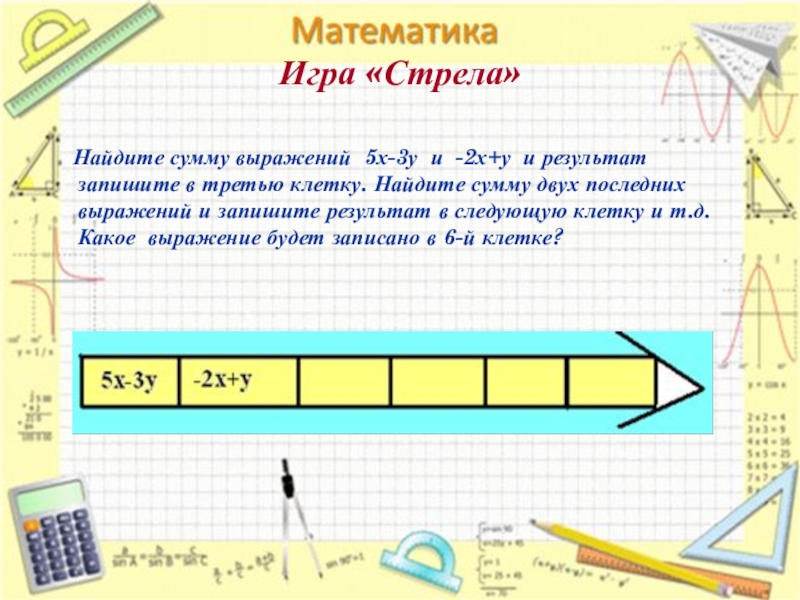 Игра «Стрела»   Найдите сумму выражений 5х-3у и -2х+у и результат запишите в третью клетку. Найдите