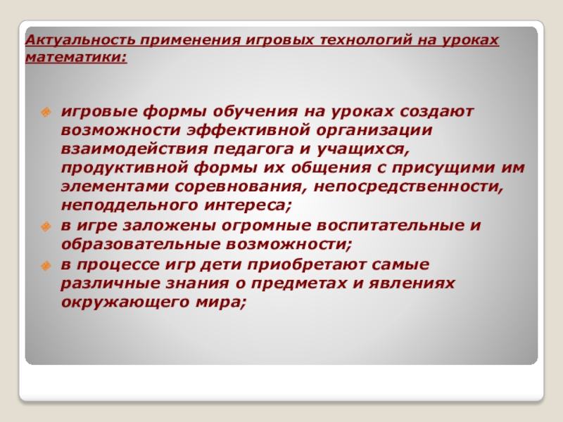 Актуальность применения игровых технологий на уроках математики: игровые формы обучения на уроках создают возможности эффективной организации взаимодействия