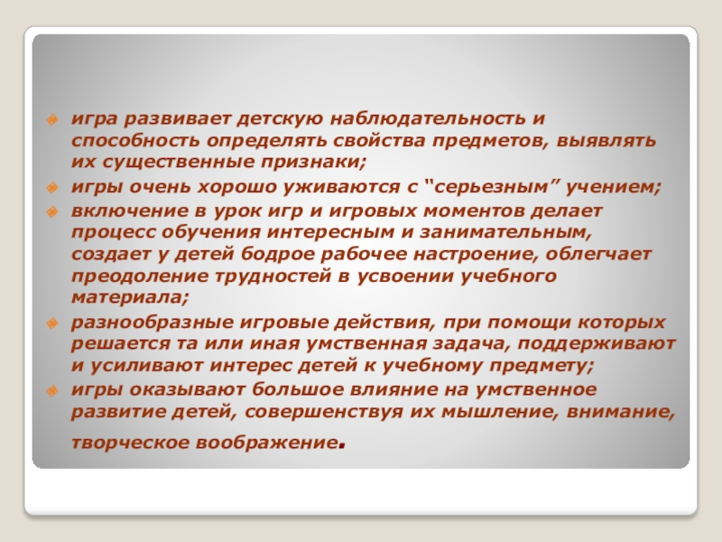 игры оказывают большое влияние на умственное развитие детей, совершенствуя их мышление, внимание, творческое воображение.