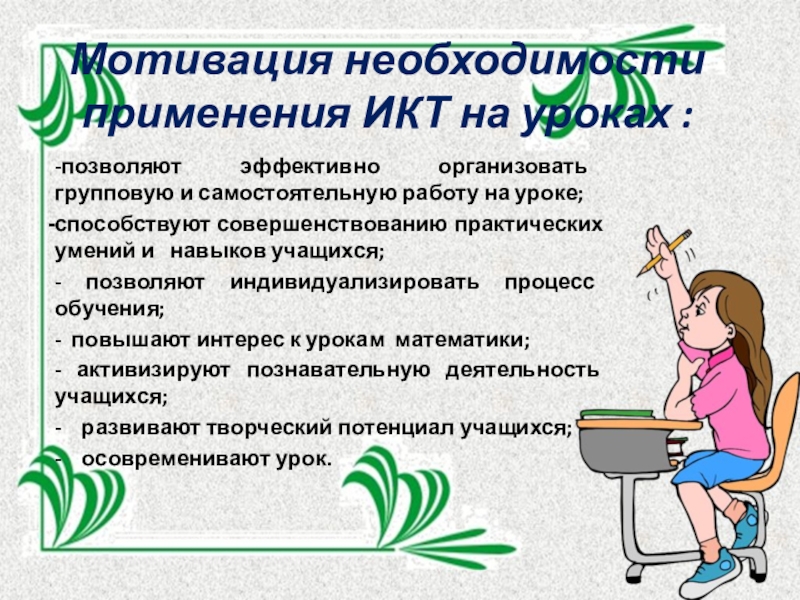 Слайд 16Мотивация необходимости применения ИКТ на уроках :