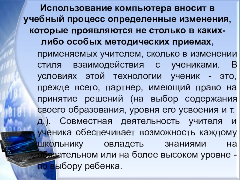 Слайд 4Использование компьютера вносит в учебный процесс определенные изменения, которые проявляются не