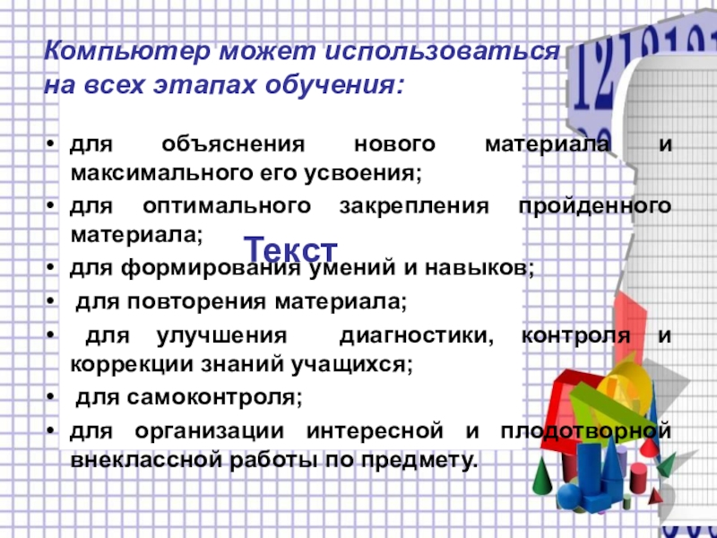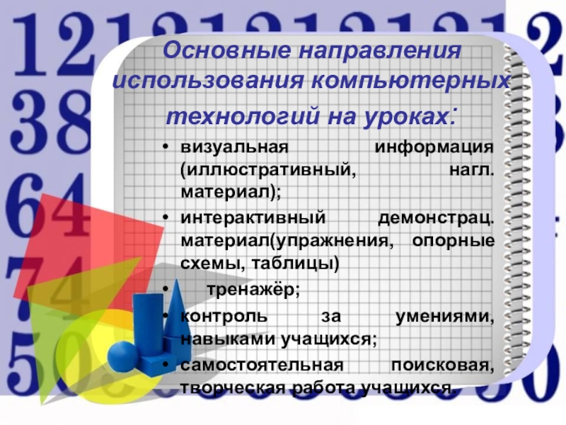 Слайд 14Основные направления использования компьютерных технологий на уроках: