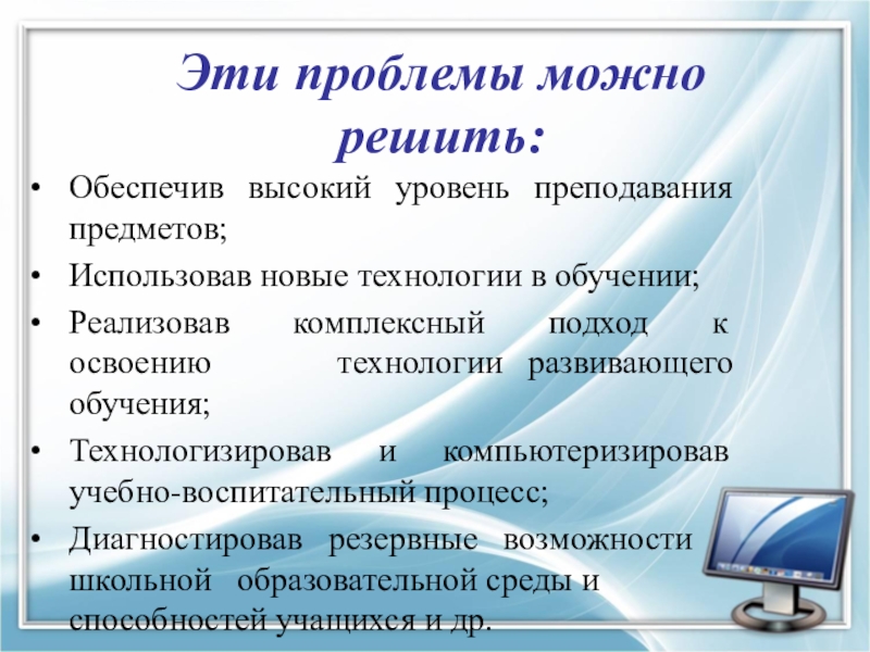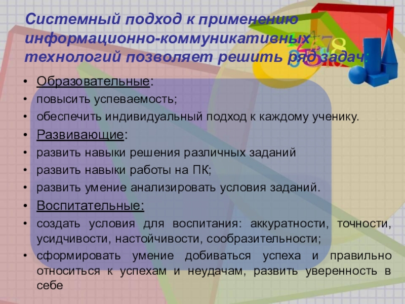 Системный подход к применению информационно-коммуникативных технологий позволяет решить ряд задач: