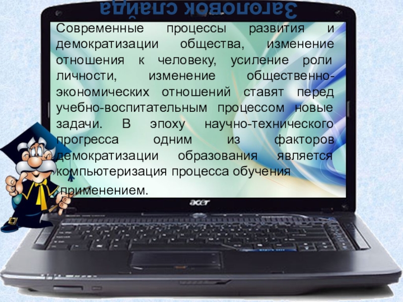 усиление роли личности, изменение общественно-экономических отношений ставят перед учебно-воспитательным процессом новые задачи. В эпоху научно-технического прогресса одним из факторов демократизации образования является компьютеризация процесса обучения