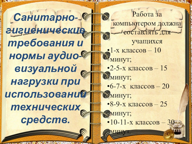 Слайд 24Санитарно-гигиенические требования и нормы аудио- визуальной нагрузки при использовании технических средств.