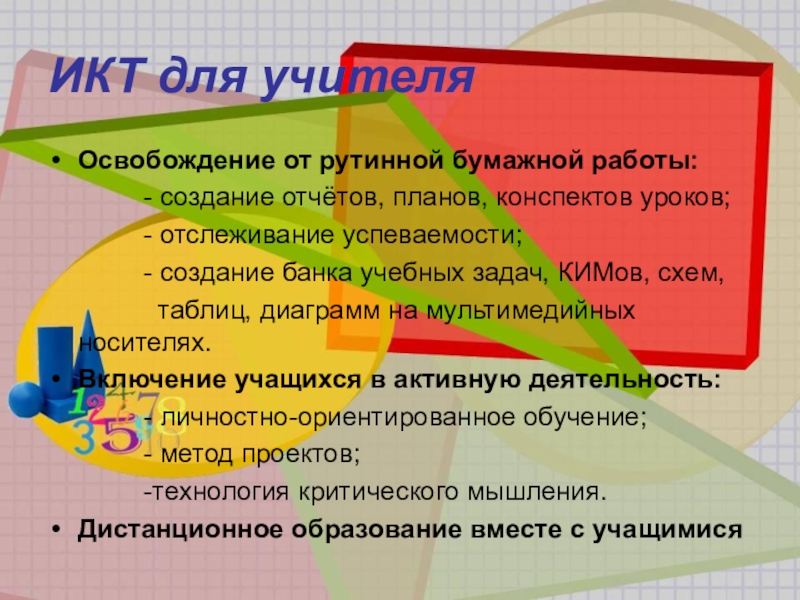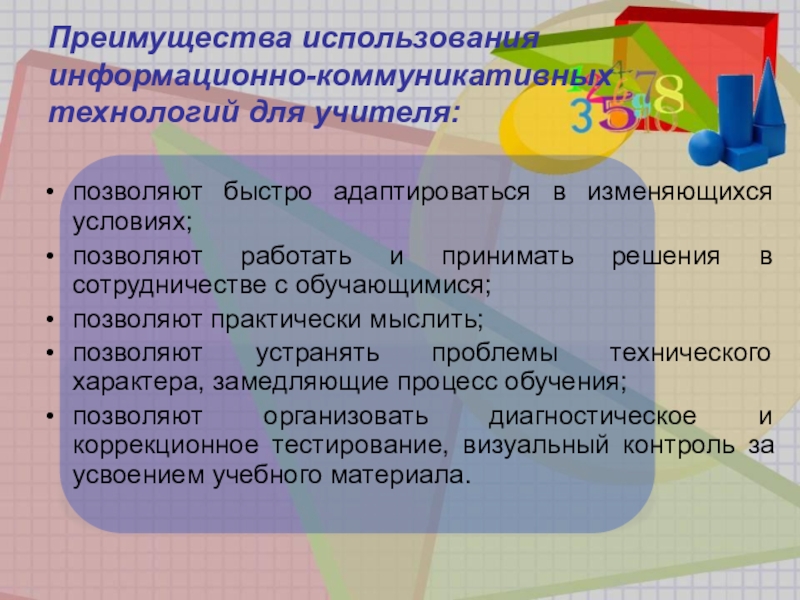 Преимущества использования информационно-коммуникативных технологий для учителя: