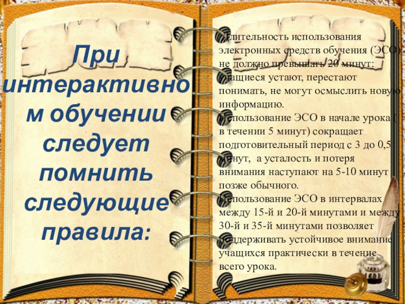 обучения (ЭСО) не должно превышать 20 минут: учащиеся устают, перестают понимать, не могут осмыслить новую информацию.