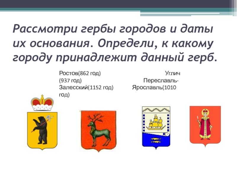 Ростов(862 год) Углич(937 год) Переславль-Залесский(1152 год) Ярославль(1010 год)
