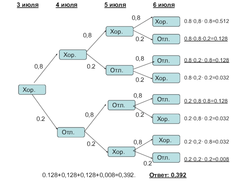 и отличная, причём погода, установившись утром, держится неизменной весь день. Известно, что с вероятностью 0,8 погода завтра будет такой же, как и сегодня. Сегодня 3 июля, погода в Волшебной стране хорошая. Найдите вероятность того, что 6 июля в Волшебной стране будет отличная погода.