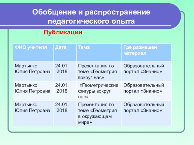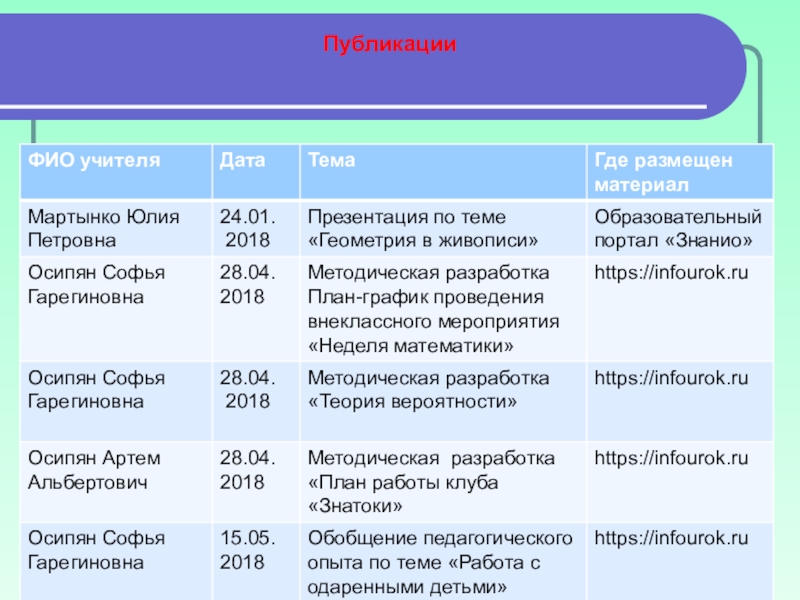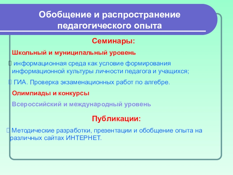 Методические разработки, презентации и обобщение опыта на различных сайтах ИНТЕРНЕТ.